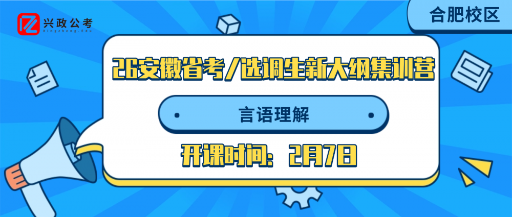 备战26安徽省考、选调生笔试,言语理解还在因主旨抓不准、逻辑填空易纠结、语句表达总出错频频失分?文段阅读耗时久、选项辨析无思路、双考模式下正确率始终上不去?2月7日,兴政公考言语理解专项集训营(合肥校区)重磅开课,带你精准适配双考命题规律,一举突破言语理解备考瓶颈!